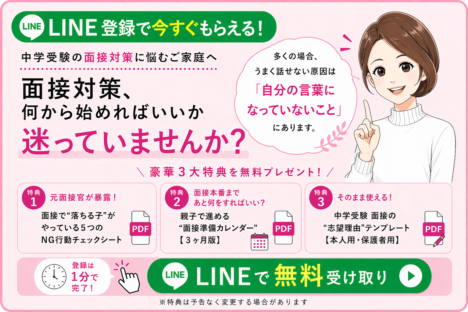 今回、面接合格マニュアルを受け取って頂ける皆さんには、絶対に志望校に合格してもらいたいので、5つの特典も無料でお付けする事にしました。